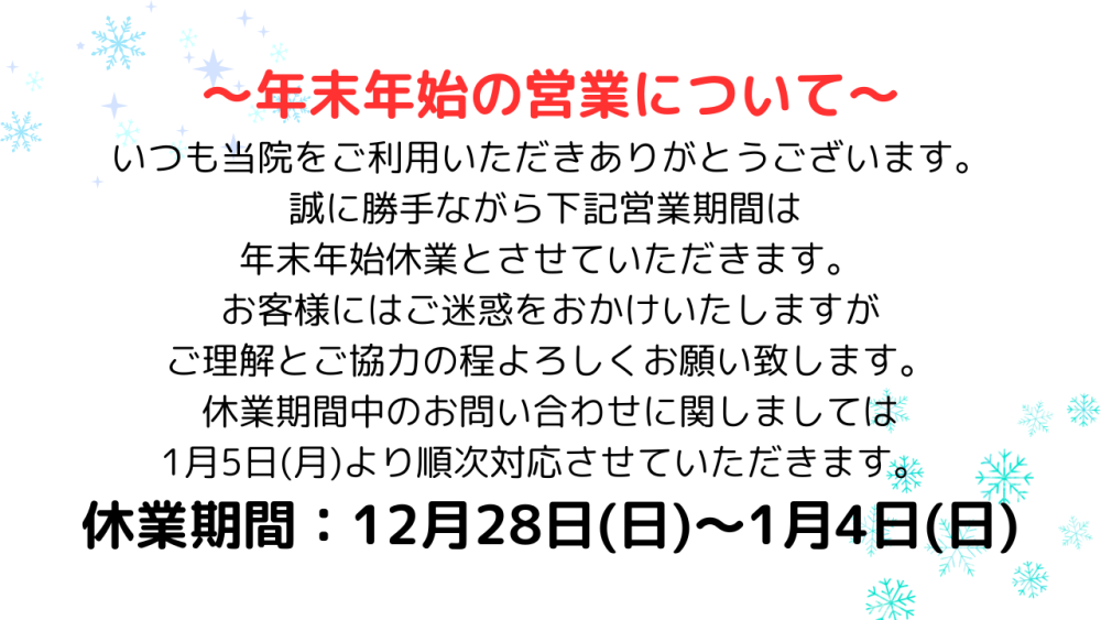 ~年末年始の営業について~ いつも当院をご利用いただき ありがとうございます。 誠に勝手ながら下記営業期間は 年末年始休業 とさせていただきます。 お客様にはご迷惑をおかけいたしますが ご理解とご協力の程よろしくお願い致します。 休業期間中のお問い合わせに関しましては 1月6日(月)より順次対応させていただきます。 休業期間:12月29日(日)~1月5日(日